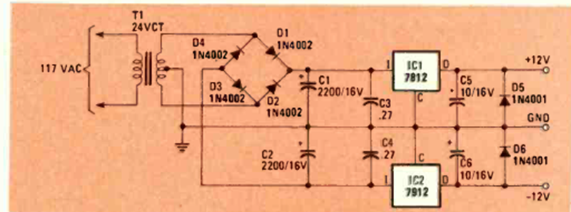 Esta fuente simétrica aparece en nuestra sección en muchas versiones. Esto es de la revista Radio Electronics de julio de 1984. Los circuitos integrados deben estar equipados con un disipador de calor. La tensión es 12 + 12 V y la corriente es 1 A.