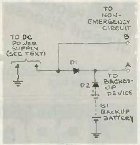 Este circuito coloca la batería en el circuito cuando se corta el voltaje de una fuente, impidiendo que se alimente. La idea surge de Radio Electronics en marzo de 1985.