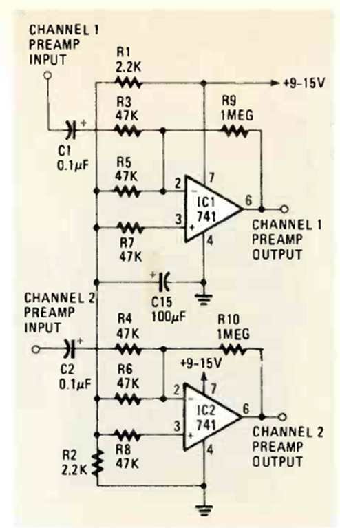 En la figura tenemos un preamplificador de dos canales con dos circuitos integrados 741. El circuito es de una Radio Electronics de marzo de 1986. La fuente no es simétrica.