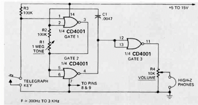 Recomendado para la práctica de telegrafía, este circuito fue encontrado en la revista Radio Electronics de diciembre de 1974. El circuito es para auriculares de alta impedancia y puede alimentarse con tensiones de 5 a 15 V.