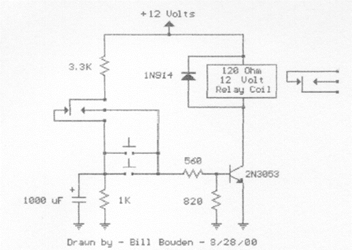Encontramos este circuito en documentación de los años 90. El circuito tiene cerradura. La alimentación debe ser acorde con el relé y el transistor debe ser de propósito general con corriente capaz de activar el relé.
