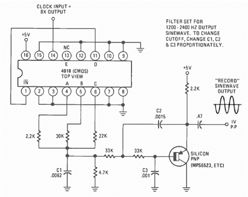 En la figura tenemos la forma de generar una señal sinusoidal utilizando un circuito integrado CMOS. El circuito es de una Radio Electronics de noviembre de 1976. La frecuencia depende de los condensadores.