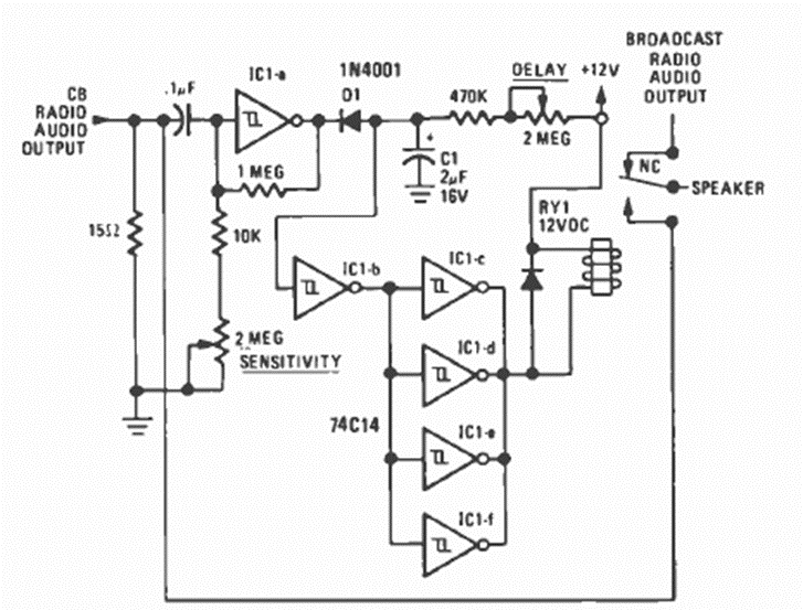 Este relé controlado por señal de audio se publicó en la revista Radio Electronics en julio de 1977. El circuito utiliza componentes CMOS y el relé debe ser de tipo sensible.