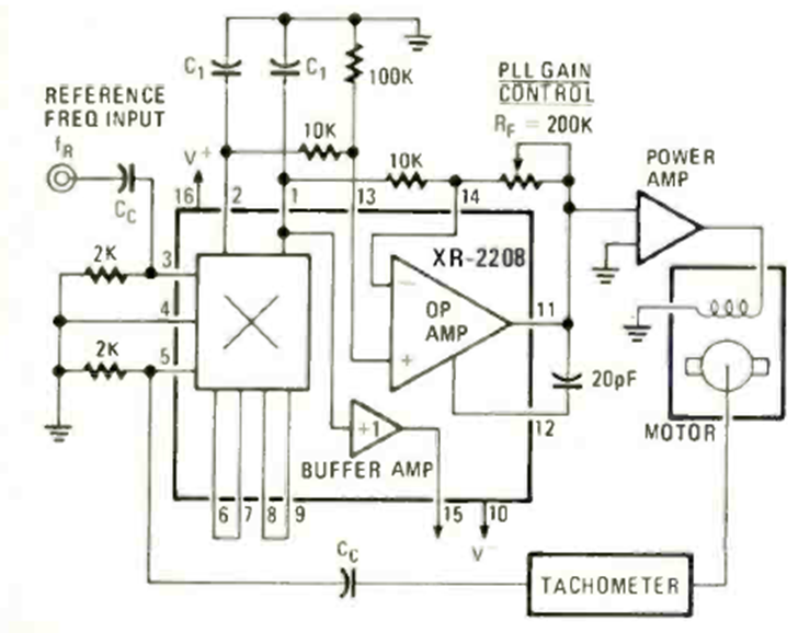 Utilizando el circuito integrado XR2208 encontramos esta aplicación en la revista Radio Electronics de abril de 1978. El circuito requiere de una etapa de potencia y debe ser alimentado por una fuente simétrica de 15 V.