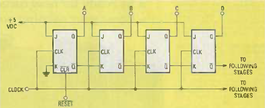 Este circuito lógico que transfiere el nivel de una puerta a la siguiente con cada pulso de reloj se encontró en la revista Radio Electronics de septiembre de 1985.