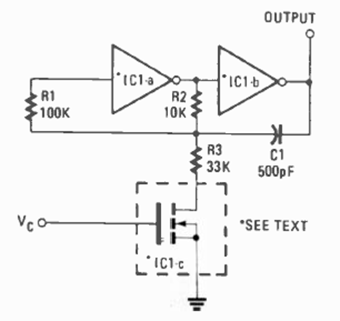 Este circuito muestra que podemos implementar un oscilador controlado por voltaje con prácticamente cualquier CMOS que pueda conectarse como inversor. El circuito es de una Radio Electronics de enero de 1987.