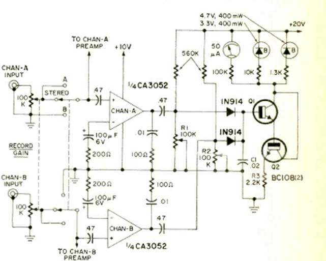 Este medidor-indicador estéreo se encontró en la revista Radio Electronics de agosto de 1971. Los transistores son tipos conocidos y se pueden utilizar los equivalentes plásticos modernos BC548.