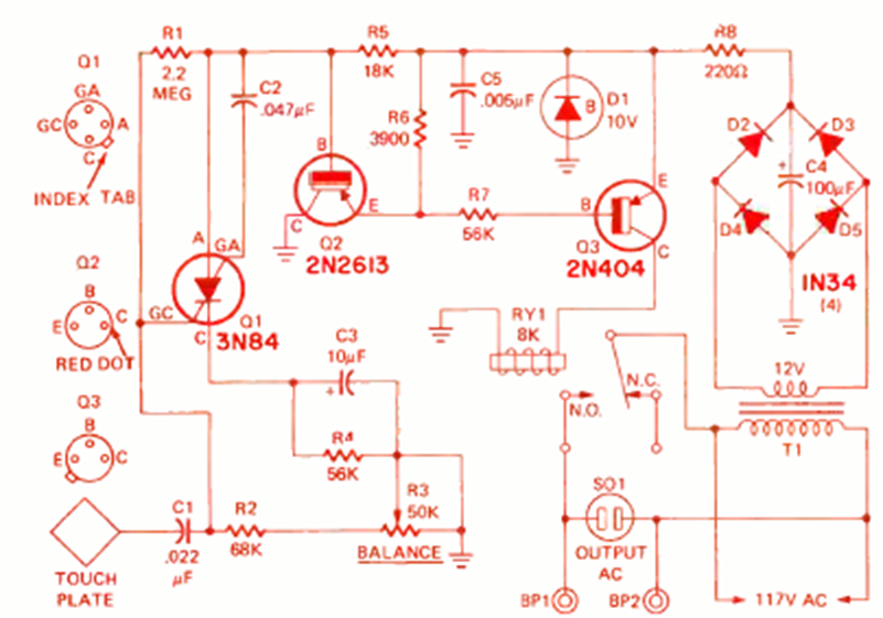 Este circuito es de un artículo de la revista Radio Electronics de agosto de 1972. El circuito se basa en un transistor unijuntura programable que activa un relé. El circuito utiliza transistores comunes en la época.