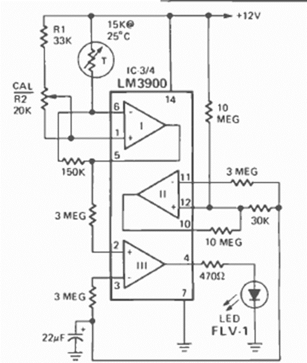 El propósito de este circuito con el LM3900 es detectar la temperatura exterior activando un indicador LED cuando cae por debajo de cero. El circuito es de una revista Radio Electronics de enero de 1975.