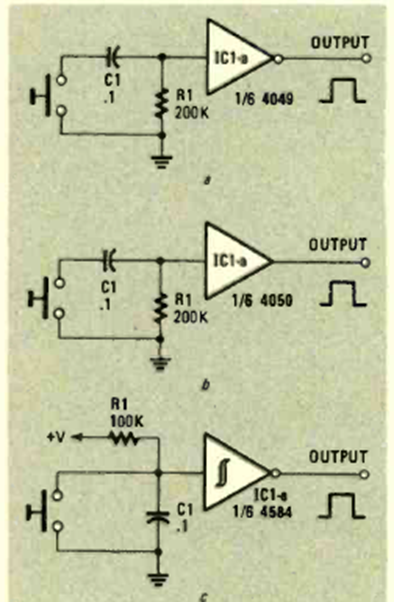 En la figura tenemos 3 circuitos CMOS monoestables que pueden usarse como interruptores anti-rebote. Los circuitos deben alimentarse según la lógica utilizada.