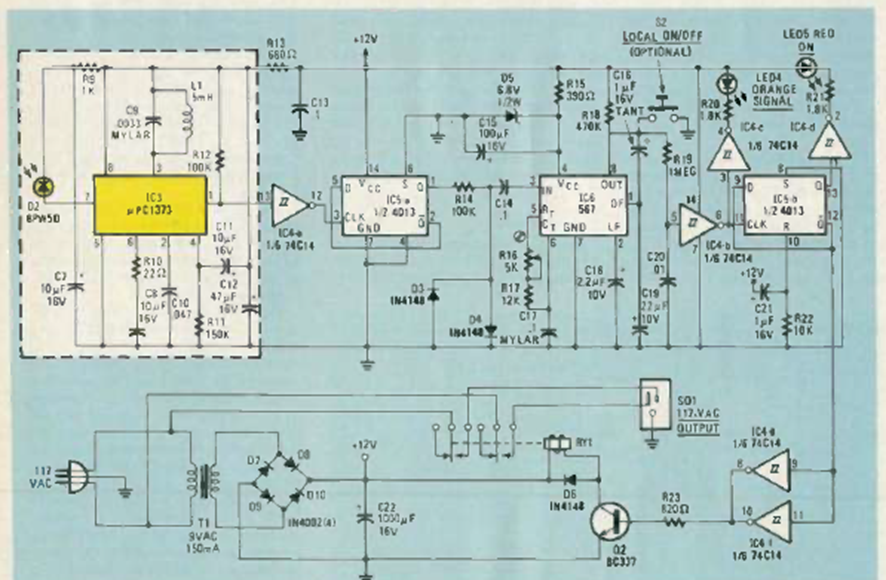 Este es el circuito receptor del transmisor del circuito anterior mediante un circuito integrado de período. El circuito está en la misma revista Radio Electronics de agosto de 1986.
