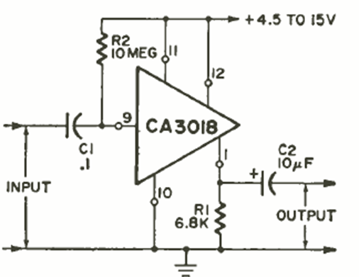 Utilizando el CA3018 lanzado en ese momento, este circuito se encontró en la revista Radio Electronics de agosto de 1970. El circuito tiene una resistencia de entrada de 5 megaohms.