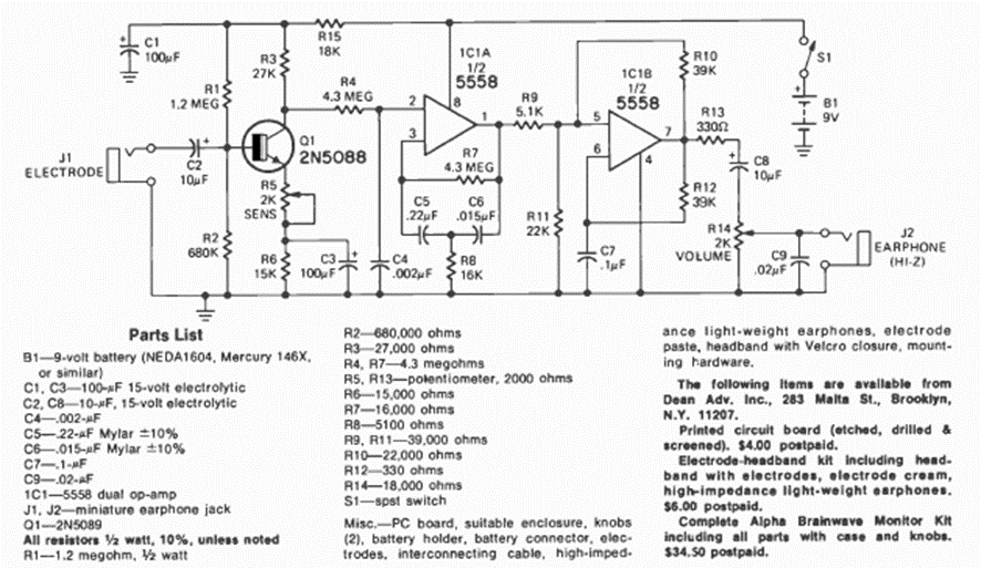 Este circuito apareció en la revista Radio Electronics en enero de 1975. Un artículo enseñaba cómo montarlo. Los amplificadores operacionales utilizados admiten equivalentes modernos e incluso el 741 se puede utilizar, ya que el 5558 consta de una versión doble de este componente.