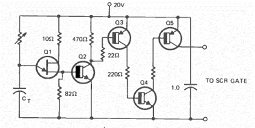 Este circuito generador de impulsos de disparo de transistor unijuntura se encontró en la revista Radio Electronics de marzo de 1973. Los valores típicos para Re CT son 100k y 220 nF.
