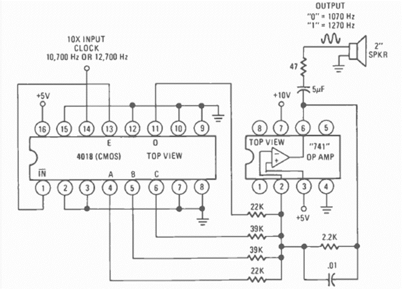 Este generador CMOS con el 4018 se encontró en la revista Radio Electronics de noviembre de 1976. Utiliza un 741 op como amplificador de audio.