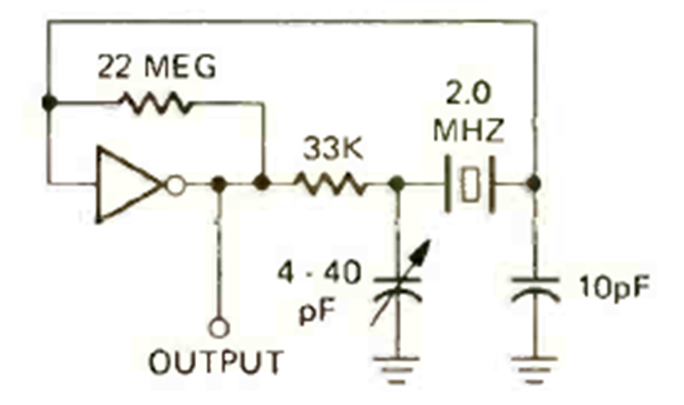 Este oscilador puede utilizar cualquier inversor CMOS. El circuito está controlado por cristal y se encontró en la revista Radio Electronics de diciembre de 1973.