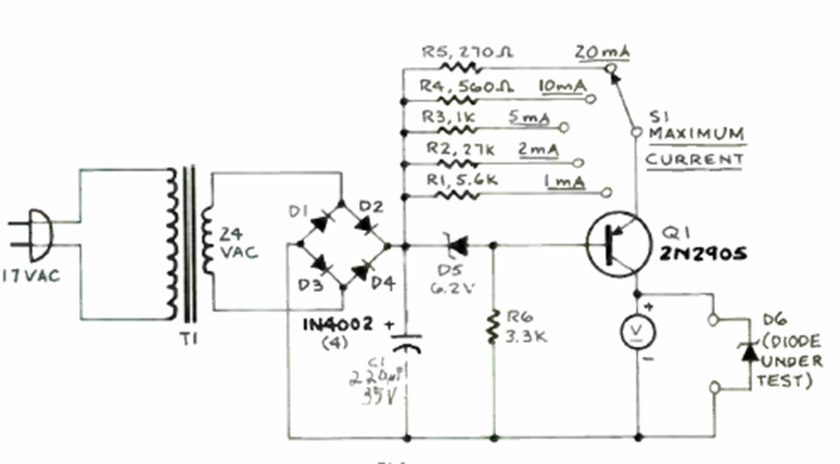 El objetivo de este circuito que encontramos en Radio Electrónica de noviembre de 1986 es determinar el voltaje de un diodo zener. Se pueden seleccionar varias corrientes de prueba.