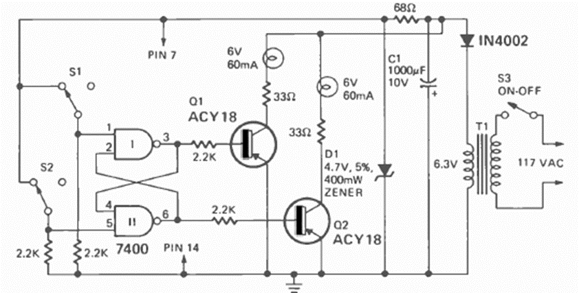 Este circuito TTL lo encontramos con el 7400 en la revista Radio Electronics de enero de 1975. La alimentación debe ser acorde con el relé recordando que el TTL debe recibir 5 V que viene dado por la resistencia de 68 ohms de este circuito.