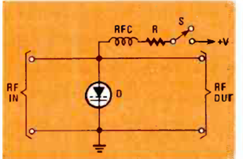 Este circuito de conmutación de señal para RF utiliza diodos PIN. El circuito es de una revista de Radio Electronics de julio de 1982. La tensión de conmutación es de unos pocos volls.