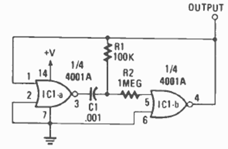 Este oscilador se encontró en la revista Radio Electronics de enero de 1987. La frecuencia viene dada por C1 y la salida tiene buena simetría. La fuente de alimentación suele oscilar entre 3 y 12 V.