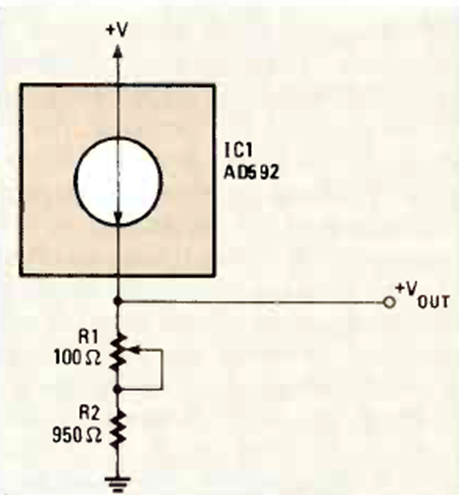 En la figura tenemos el circuito básico de un sensor de temperatura con el IC termométrico AD592. Este circuito se puede utilizar desde -25º C hasta 150º C. El circuito es de Radio Electronics de marzo de 1987. La alimentación oscila entre 4 y 30 V.