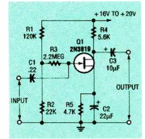 Encontramos este circuito en la edición de abril de la revista Electronics Now en la aplicación 3. Se puede utilizar cualquier JFET. Tenga en cuenta las tensiones de alimentación relativamente altos.
