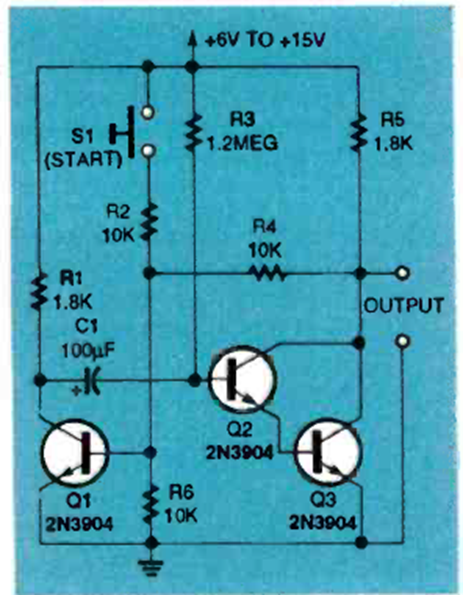 Este temporizador de 3 transistores se encontró en la edición de enero de 1994 de la revista Electronics Now. Los transistores son de propósito general y en la salida tenemos un pulso de disparo.