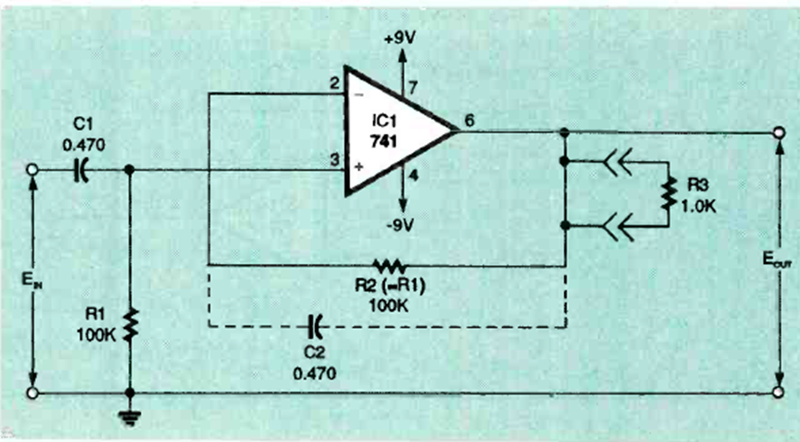 Este circuito fue encontrado en la revista Electronics Now de enero de 1995. Su configuración es válida para otros operacionales. La fuente debe ser simétrica.