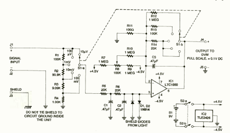 Encontramos este circuito en la edición de abril de 1996 de la revista Electronics Now. El circuito utiliza una fuente simétrica y es parte de un proyecto de instrumentación.