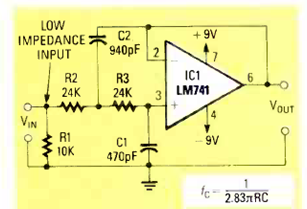 Este circuito se encontró en la edición de mayo de 1989 de la revista Radio Electronics. Los componentes se pueden cambiar para que funcione en otra frecuencia. El circuito requiere una fuente de alimentación simétrica.