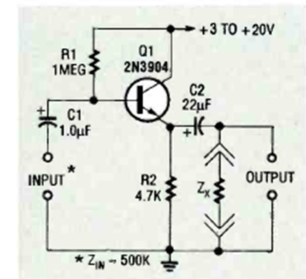En la figura tenemos la forma de implementar un paso con un seguidor de emisor. El escenario tiene alta impedancia de entrada y baja impedancia de salida. El circuito es de Electronics Now de octubre de 1993.