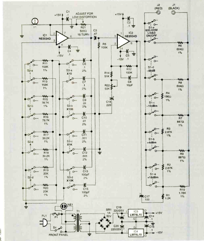 Este circuito fue encontrado en la revista Electronics Now de septiembre de 1997. El circuito utiliza dos operaciones e incluye la fuente de alimentación simétrica.