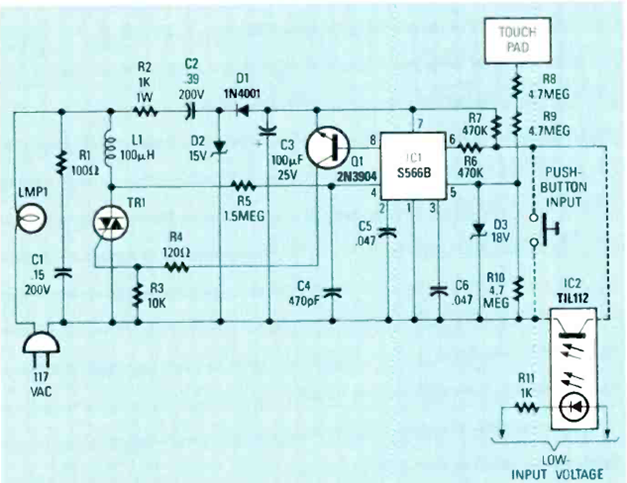 Este circuito fue encontrado en la revista Radio Electronics de octubre de 1987. Puede utilizarse como protección para lámparas incandescentes y elementos calefactores.