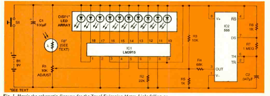 Este circuito fue encontrado en la edición de noviembre de 196 de la revista Electronics Now. Utiliza un LDR como sensor y tiene una escala Bargraph con el conocido LM3914.