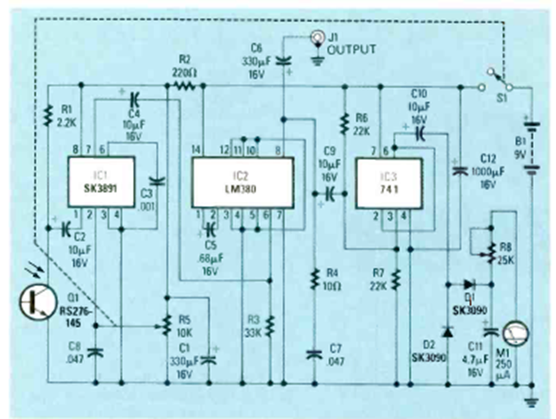 Este circuito recibe las señales moduladas reflejadas por un láser en el cristal de una ventana, permitiendo escuchar conversaciones. El circuito es de un proyecto de la revista Radio Electronics de octubre de 1987.