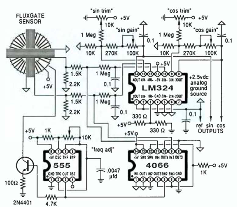 Este circuito es de un artículo de la revista Radio Electronics de diciembre de 1988 que enseña cómo ensamblar una brújula electrónica. La brújula se basa en un transformador de flujo toroidal cuyo campo magnético se altera por el campo terrestre y así detecta la dirección de las líneas de fuerza e indica el Norte.
