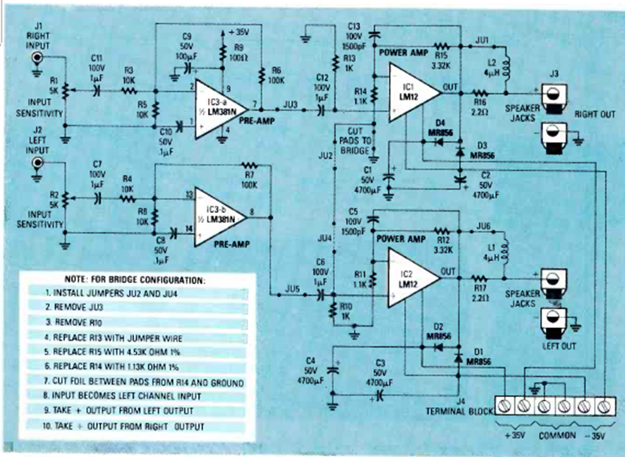 Encontramos este buen amplificador de potencia con el circuito integrado LM12 en la revista Radio Electronics de marzo de 1989. La potencia de salida es del orden de 100 W.
