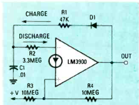 Este circuito utiliza un amplificador operacional Norton para generar pulsos de 1 kHz con una relación marca-espacio de 1 a 60. El circuito se puede modificar para generar otras relaciones marca-espacio.