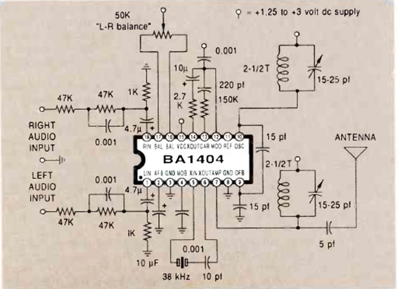 Utilizando un circuito integrado BA1404, este pequeño transmisor estéreo de FM fue encontrado en una revista de Radio Electronics de octubre de 1989. Las bobinas están indicadas.