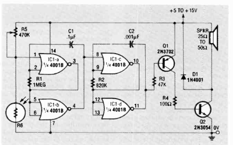 Este circuito se encontró en la edición de julio de 1992 de la revista Radio Electronics. El circuito de salida debe estar equipado con un disipador de calor.