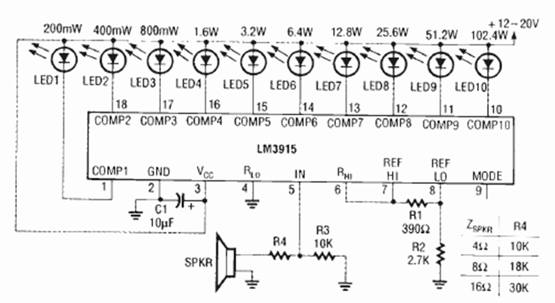 Utilizando un pequeño altavoz como micrófono, este circuito de 10 LED fue encontrado en la edición de marzo de 1992 de la revista Radio Electronics. Observe en la tabla los valores de R4 según la impedancia del altavoz.