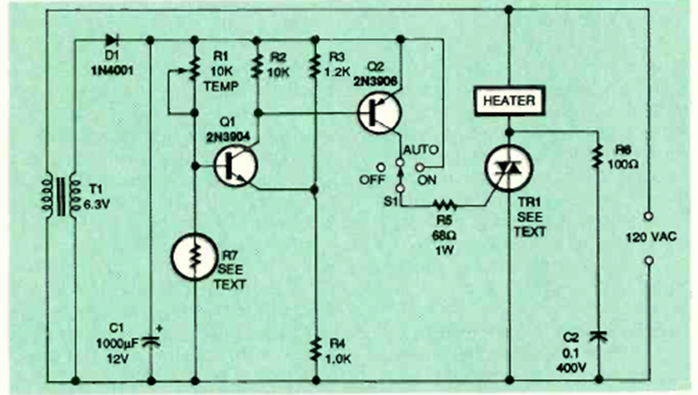 Este circuito se obtuvo de la revista Electronics Now de julio de 1995. El triac depende de la corriente del elemento calefactor y el sensor determinará el potenciómetro de ajuste.