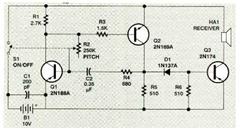 Este zumbador o buzzer de 3 transistores es un tipo clásico que se encuentra en la edición de julio de 1998 de la revista Electronics Now. La potencia de salida depende del transistor de salida.