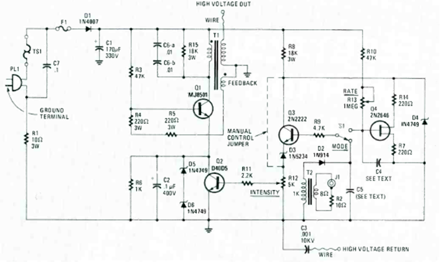 Este circuito de muy alto voltaje fue encontrado en la edición especial de 1990 de la revista Radio Electronics Experimenter. El circuito consta de una bobina de Tesla.