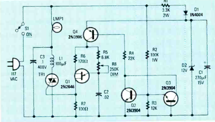 El circuito es de una revista de Radio Electronics de octubre de 1987. El Triac debe estar equipado con un disipador de calor y los transistores son de propósito general.