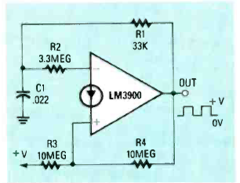 Este oscilador de 1 kHz utiliza un amplificador operacional de Norton LM3900. La frecuencia depende de C1 y R1 y se puede cambiar.