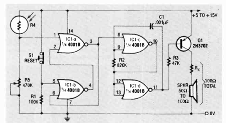 Esta alarma integrada CMOS se encontró en la revista Radio Electronics de julio de 1992. El circuito tiene una pequeña etapa de potencia y su sensibilidad se ajusta en R5.