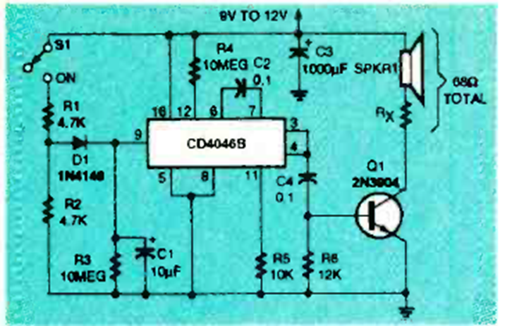 Encontramos este circuito en la edición de octubre de 1994 de la revista Electronics Now. El IC CMOS es poco común hoy en día y la salida es de baja potencia.