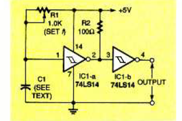 Este circuito utiliza dos inversores de disparo TTL para generar señales que se pueden ajustar en R1. El circuito es de una revista Electronics Now de marzo de 1996.