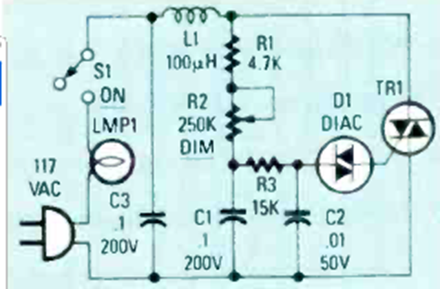 Este circuito de constante de tiempo dual se encontró en la edición de octubre de 1987 de la revista Radio Electronics. El circuito es para lámparas incandescentes y el triac debe estar provisto de un disipador de calor.